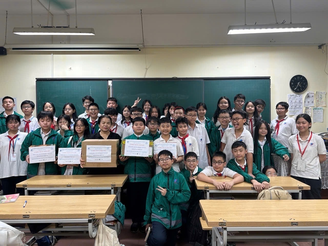 Trước giờ khởi hành, đoàn đã tiếp nhận các thùng thuốc bột bôi và ngâm chân, do cô giáo và học sinh lớp 7A6, Trường THCS&THPT Nguyễn Tất Thành (136 Xuân Thủy - Cầu Giấy - Hà Nội), thuộc Đại học Sư phạm 1 Hà Nội, gửi tặng bà con và các chú bộ đội vùng bão lũ.