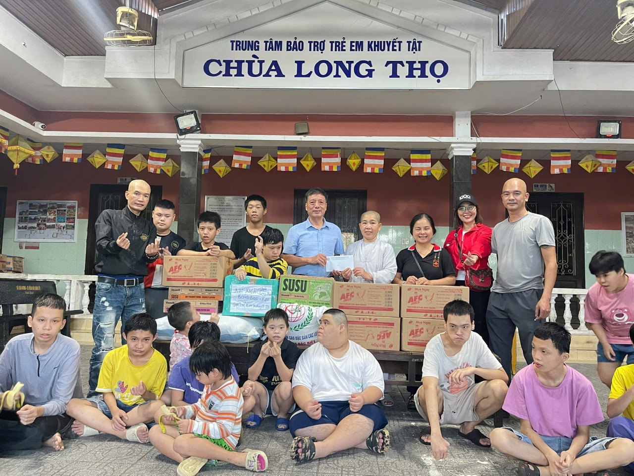 Tiếp tục hành trình tại cố đô Huế, đoàn đã ghé thăm Trung tâm bảo trợ Chùa Long Thọ, trao 6 tạ gạo tẻ, 40kg gạo nếp. 50 lít dầu ăn, 50 lít nước mắm, 4 0kg gia vị, 30kg chả cá, 70 thùng mỳ tôm, 20kg lạc rang, 50 thùng sữa, 50 hộp xúc xích, 07 thùng bánh quy và nhiều phần quà cho 110 trẻ em, tổng trị giá là 40 triệu đồng.