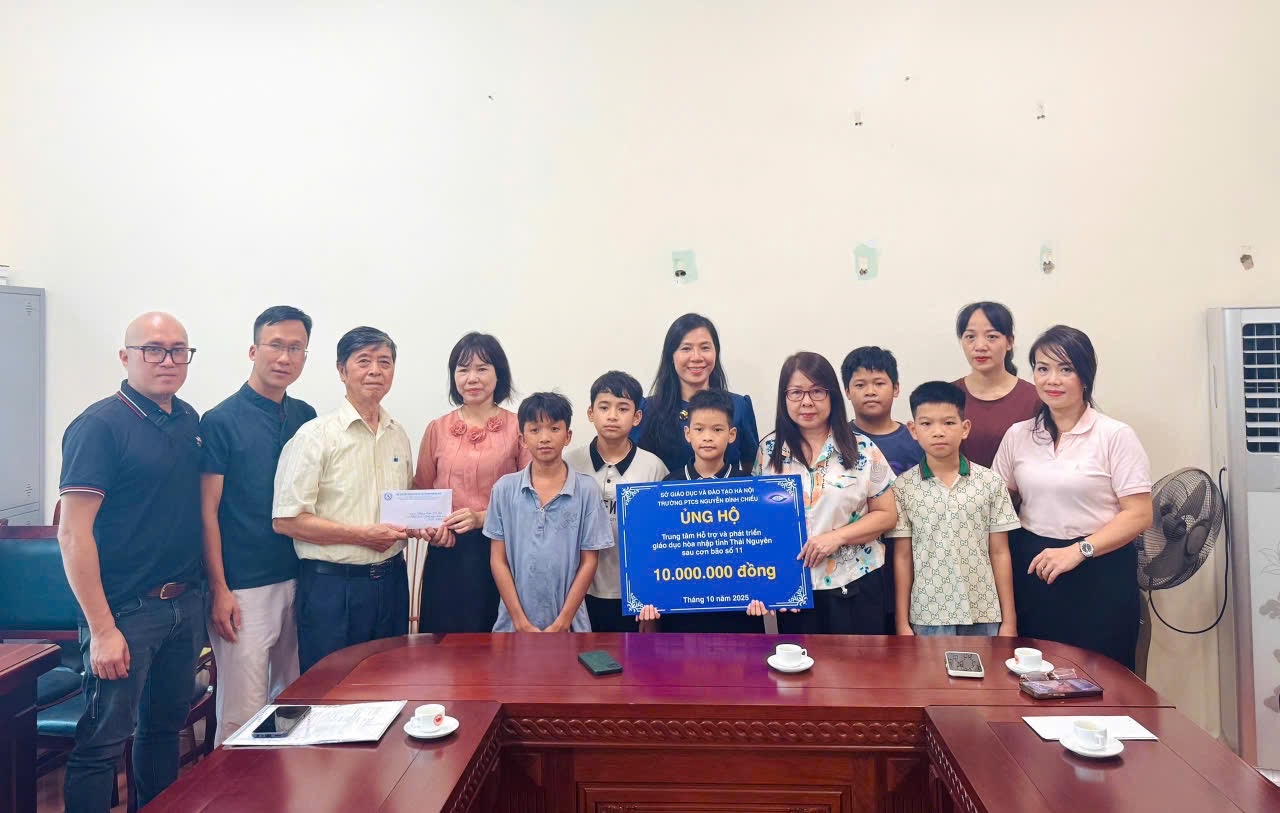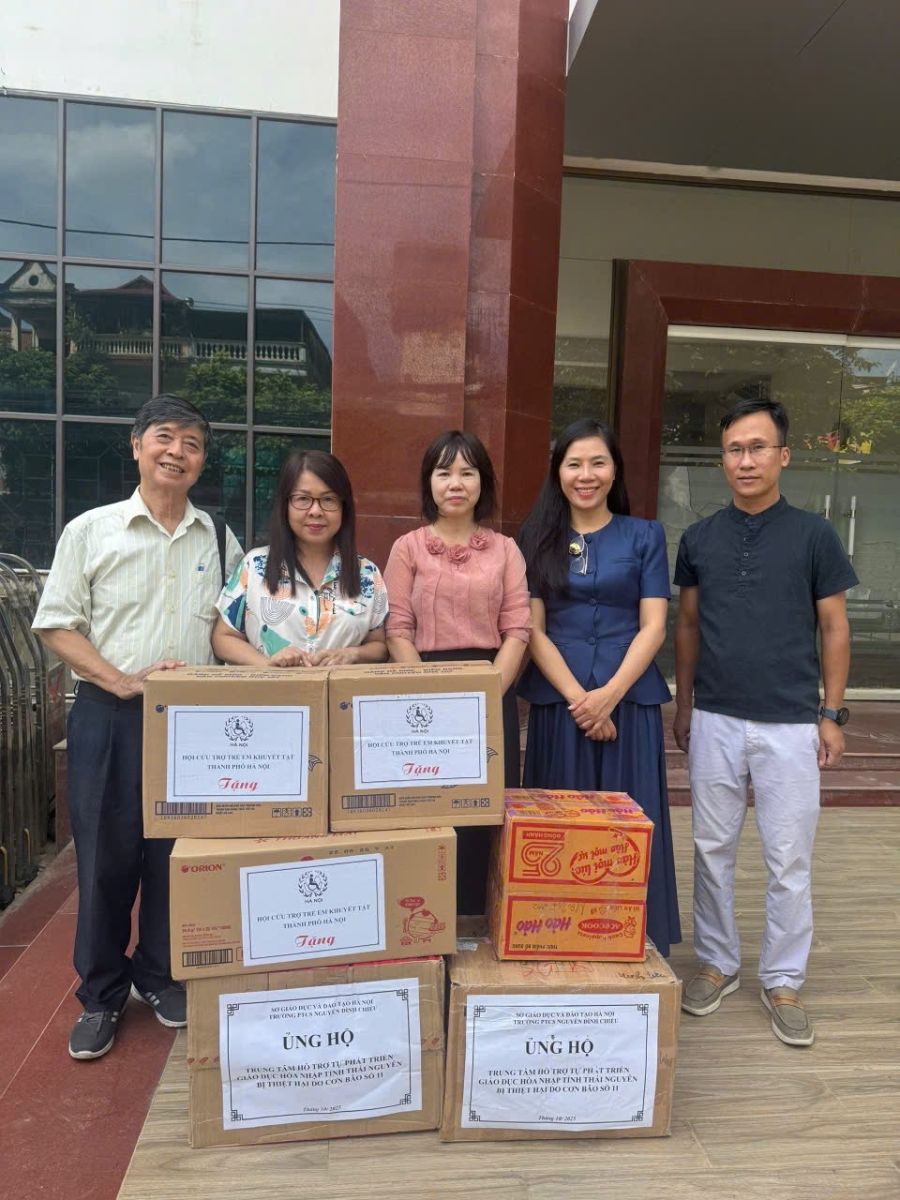 Sáng 16-10, Đoàn công tác của Hội Cứu trợ trẻ em khuyết tật TP Hà Nội và Trường PTCS Nguyễn Đình Chiểu do ông Phạm Hữu Quỳ, Chánh Văn phòng Hội và bà Nguyễn Thị Tuyết Mai, UVBCH Hội, Hiệu trưởng Trường PTCS Nguyễn Đình Chiểu đã đến chia sẻ, trao quà Trung tâm Hỗ trợ và Phát triển giáo dục hòa nhập và Trung tâm trợ giúp xã hội trẻ khuyết tật tỉnh Thái Nguyên khắc phục hậu quả do bão số 11 gây ra. Tiếp và làm việc với đoàn có cô giáo Nguyễn Thị Kim Nhung, Giám đốc Trung tâm Hỗ trợ và Phát triển giáo dục hòa nhập, cô giáo Phạm Thị Liên, Giám đốc Trung tâm trợ giúp xã hội trẻ khuyết tật.